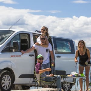 Features of the Voyager campervan: Seats: 5 people Sleeps: 4 people Beds: 1x queen & 1x double Extra large storage areas Minimal branding Dual battery with mains hookup Minimum age to hire: 21 Large side awning Class leading fuel economy Water tank (15 litres) Fridge/freezer (40 litres) 2-burner gas cooker Cutlery & crockery Technical specifications: Vehicle: Ford Transit Custom Transmission: Manual Engine size: 2.2 litre (diesel) Fuel tank: 95 litres Fuel consumption: 7 litres / 100 km Safety rating: 5 star Euro NCAP Power steering: yes Mains power points: 2 Aircon & heating: yes (in driver's cabin) Stereo: CD & radio + 4-way speakers Fit out: 2015 - 2016 Bed #1: 1.70 wide x 1.95m long (Queen) Bed #2: 1.40 wide x 1.75m long (Double) Side awning: 1.5m x 1.5m Baby/child friendly: 2x ISOFIX Vehicle dimensions: 4.9m length x 1.9m width x 1.9m height Interior height: 1.4m Seats: 5 Sleeps: 4 **We also do one way hires to most European destinations to or from London