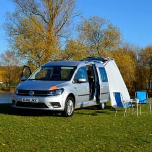Features of this premium campervan: Seats 4 | Sleeps: 2 World leading fuel economy Large double bed 2 sleeping options: fully inside or extended Mains power hookup Minimum age to hire: 21 Dual battery + electric hookup Large rear and side awnings Fridge/freezer: 35L Cooking gear Cutlery & crockery Technical specifications: Vehicle: Volkswagen Caddy Maxi Transmission: Automatic Engine size: 1.6 litre (diesel) Fuel tank: 60 litres Fuel consumption: 55 mpg (5.1 litres per 100 kms) Safety rating: 5 star Euro NCAP Power steering: yes Charger: USB charging point built in Aircon & heating: yes (in driver's cabin) Stereo: CD & AM/FM/DAB+ radio with bluetooth Fit out: 2017 Bed: 1.4m wide x 1.9m long Luggage storage: Large storage compartment Rear awning: 2.5m x 1.4m Baby/child capable: 1x ISOFIX Vehicle dimensions: 4.9m length x 1.8m width x 1.9m height Interior height: 1.35m Seats: 4 Sleeps: 2 **We also do one way hires to most European destinations to or from London